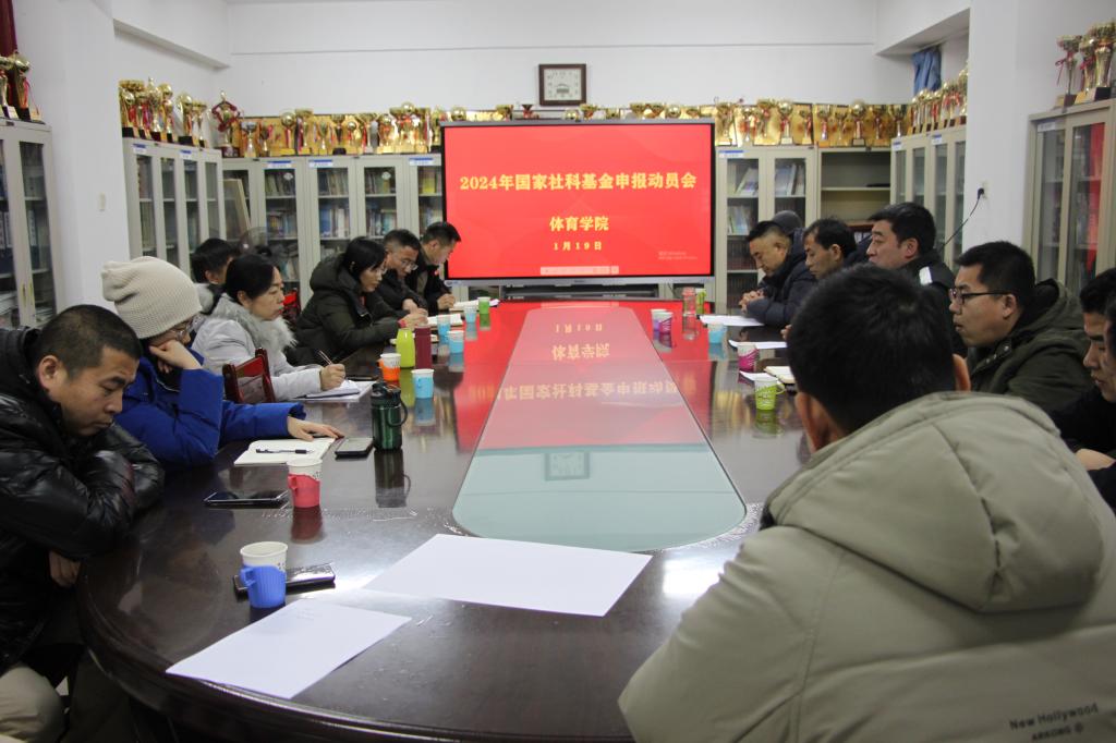 在院楼二层资料室召开2024年国家社科基金申报动员会。学院党委书记曹电康、院长吴剑,以及副教授以上职称和具有博士学位的教师参与此次会议。会议由副院长王晓刚主持。