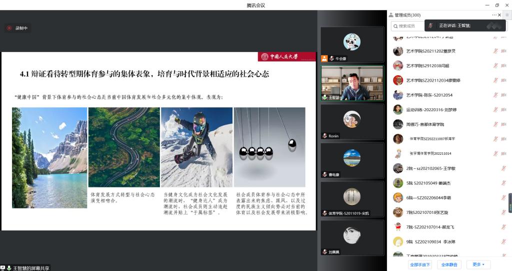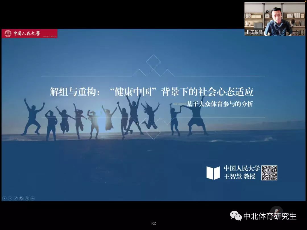 研究生第20221101期华彩讲坛于线上正式开讲,本期华彩讲坛特邀中国人民大学博士生导师王智慧教授主讲,主题为《解组与重构:健康中国背景下的社会心态适应——基于大众体育参与的分析》,由做爱视频