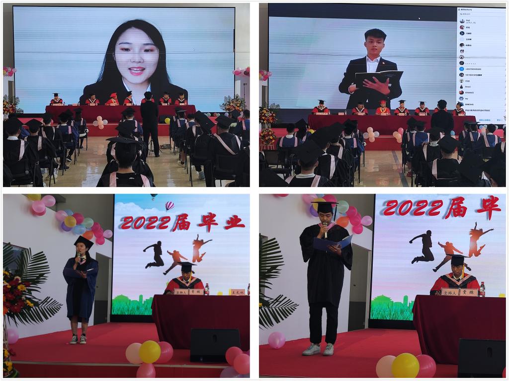 在校生代表郑璐瑶发言表达对学长、学姐的感谢与祝福;线上毕业生代表郑旭、高曌,线下毕业生代表王振州、任慧静发言,诉说了自己的不舍与感激之情,并对学院送出诚挚的祝福。参会教师代表们依次上台,寄语毕业生,祝福他们前程似锦,生活美满。