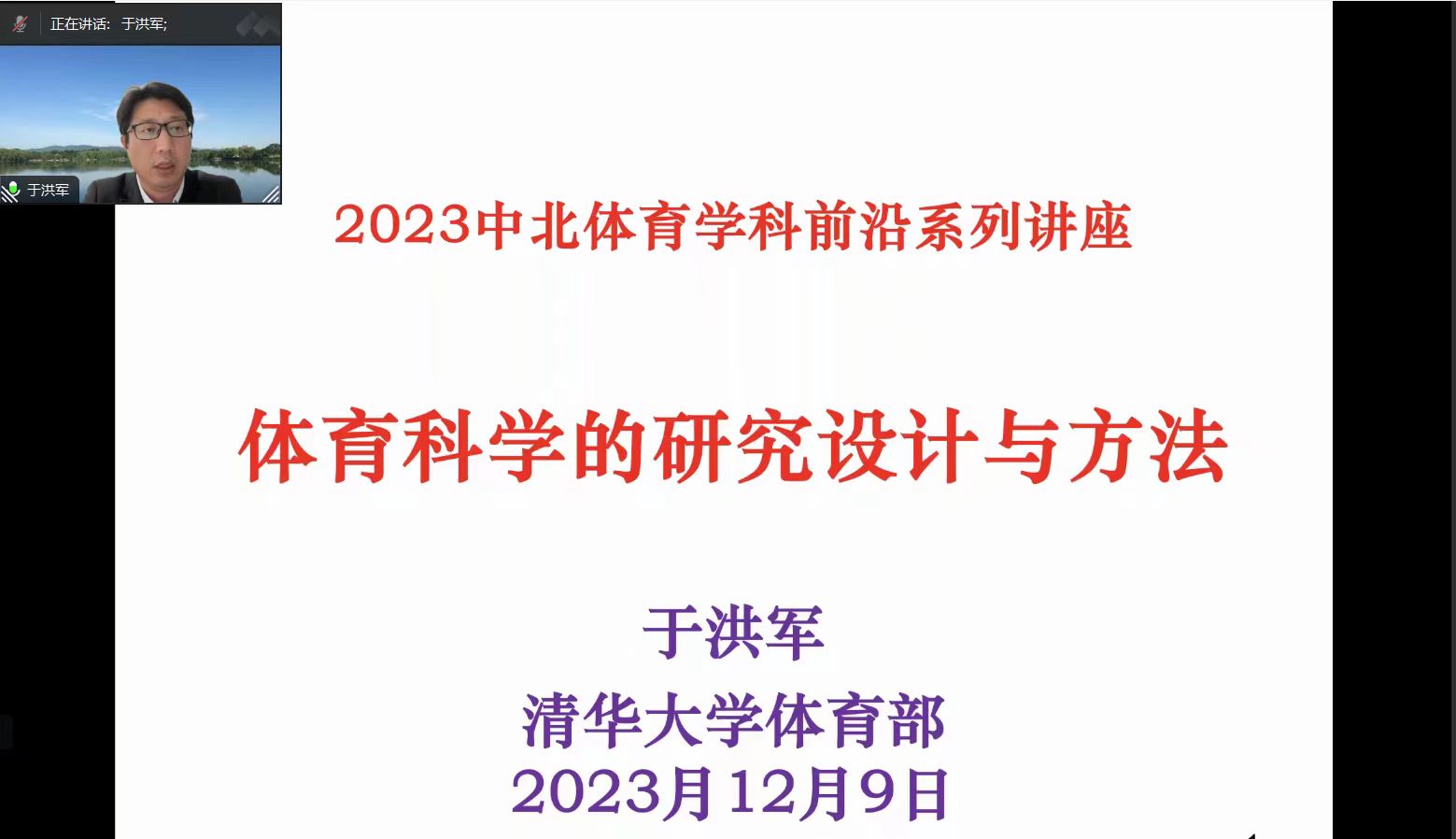 12月9日-12月12日,我院主办了中北体育学科前沿系列讲座。本次讲座采取线上与线下相结合的方式,特邀清华大学于洪军教授、上海体育大学高炳宏教授、华中师范大学陈元欣教授、华南师范大学刘鸿优教授、广州新华学院胡明一教授等六位知名专家进行讲学。讲座分别由吴剑院长、王晓刚副院长、刘鸿宇教授、贾谊教授、宿继光副教授主持,我院青年教师、全体在校研究生、本科生参加。
