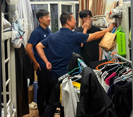 开展新学期学生宿舍卫生安全大检查。体育学院党委副书记李建国带领全体辅导员共同参与检查。检查过程中,老师们重点查看了宿舍卫生状况,包括地面清洁、物品摆放等,对表现优秀的宿舍提出表扬,同时指出部分宿舍存在的问题,督促学生及时整改。在安全检查方面,细致排查了违规电器使用、电线私拉乱接等隐患,向学生强调安全用电的重要性。