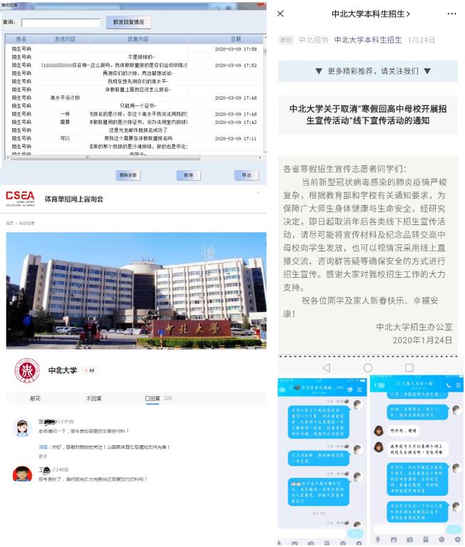 在疫情爆发前期,为了避免造成交叉感染,于1月24日(大年三十)紧急调整了年后的回高中母校本科招生宣传活动方案,要求报名学生创新方式,由线下改为线上宣传,利用QQ群、微信群等方式继续开展寒假的本科招生宣传活动。据初步统计,年前有1500余人赴全国400余所中学开展了线下宣传,年后有160余人面向70余所中学开展了线上宣传。