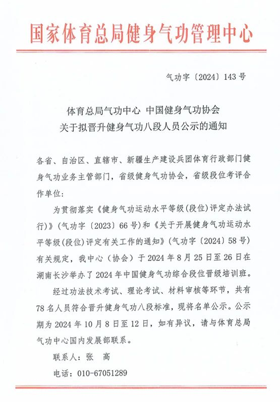 近日,为贯彻落实国家体育总局健身气功管理中心、中国健身气功协会下发的《健身气功运动水平等级(段位)评定办法(试行)》(气功字〔2023〕66号)和《关于开展健身气功运动水平等级段位评定有关工作的通知》(气功字〔2024〕58号)有关规定,经过严格的功法技术考试、理论考试及材料审核等环节,全国共有78名人员脱颖而出,符合晋升健身气功八段的标准。其中,我院康任侠老师凭借其卓越的技术水平和深厚的理论功底,成功晋升中国健身气功八段,再次彰显了在健身气功领域的深厚修为与卓越贡献。