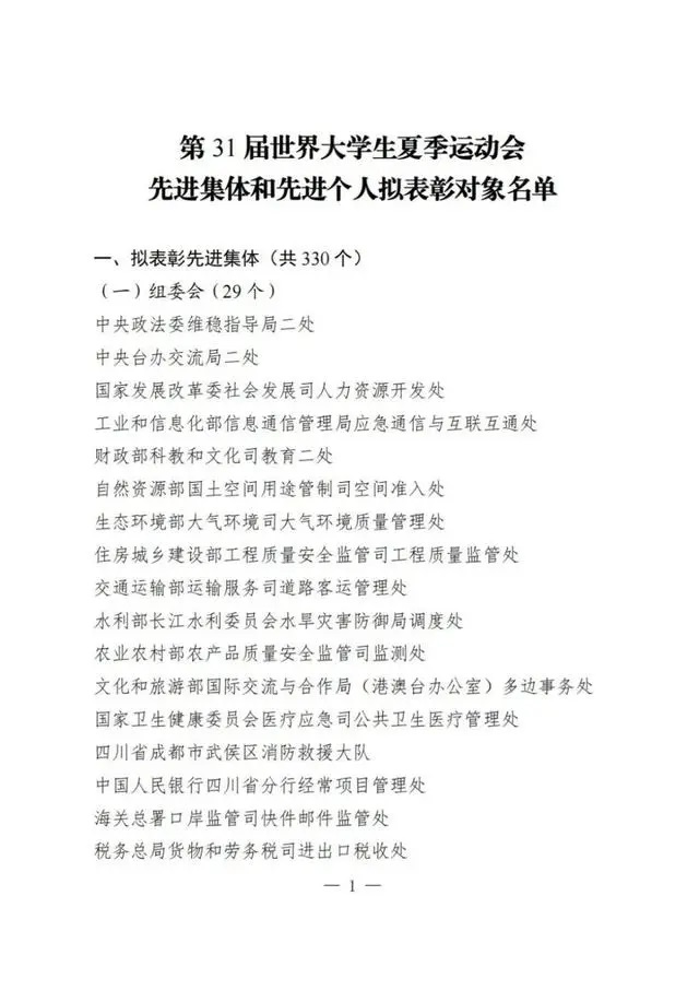 2024年2月4日,中共四川省委、四川省人民政府、教育部、国家体育总局联合印发了《关于表彰第31届世界大学生夏季运动会先进集体和先进个人的决定》,表彰在本次世界大学生运动会中成绩显著、贡献突出的先进集体和先进个人。其中,做爱视频