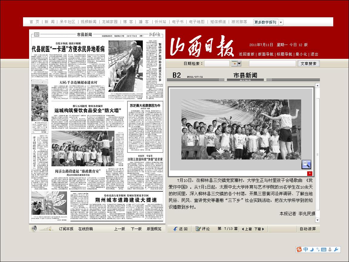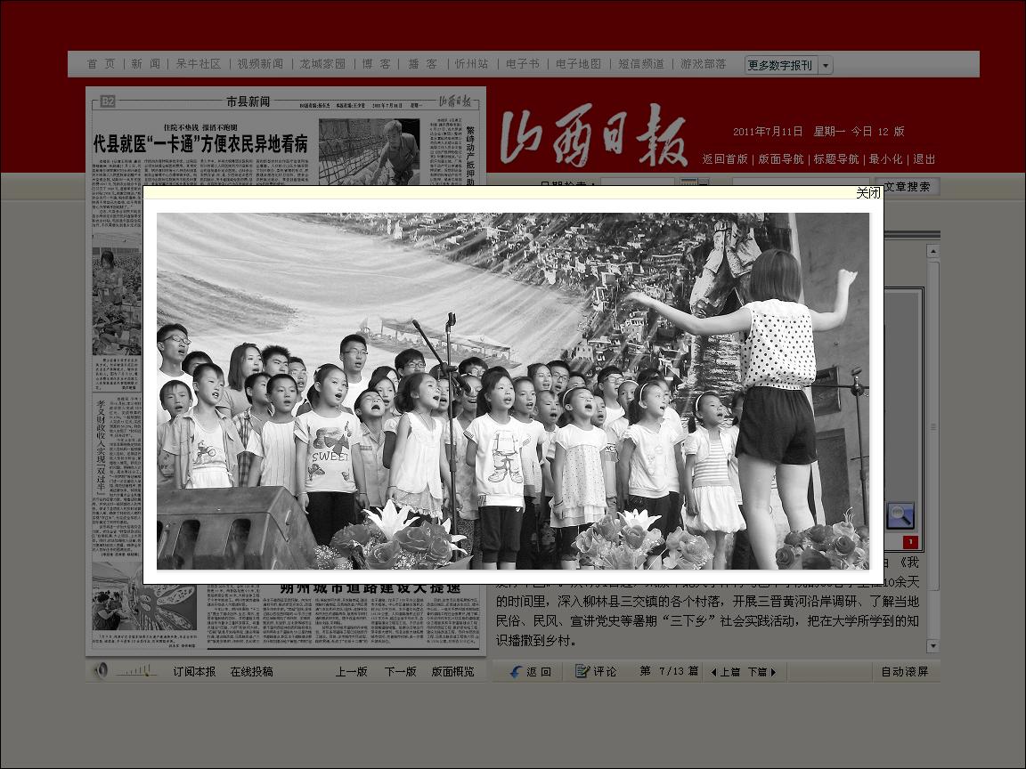 7月10日,在柳林县三交镇党家寨村,大学生正与村里孩子合唱歌曲 《我爱你中国》。从7月1日起,太原做爱视频 体育与艺术学院的35名学生在10余天的时间里,深入柳林县三交镇的各个村落,开展三晋黄河沿岸调研、了解当地民俗、民风、宣讲党史等暑期“三下乡”社会实践活动,把在大学所学到的知识播撒到乡村。 本报记者 李兆民摄