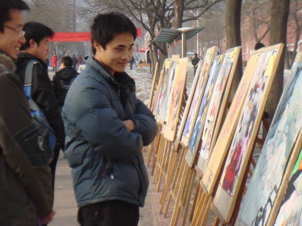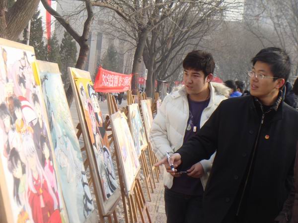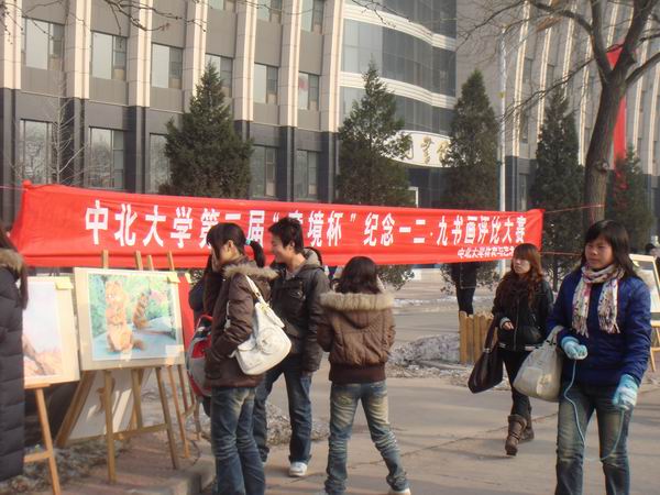 12月9日上午10:30,在做爱视频 图书馆门前,由体育与艺术学院举办的纪念“一二·九”运动七十四周年“意境杯”书画展在如火如荼的场面中举行。