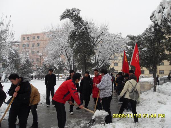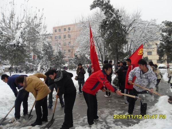 罕见的大雪在11月12日渐渐停止飘落,中北校园里白茫茫一片,道路上积满了厚厚的雪,我院团委副书记陈超、学生会主席于淼及主席团成员带领各部成员手拿铁锨笤帚等工具在院楼门前进行了除雪活动。天气很冷,可是并没能阻止大家的热情。雪层经过了两天的积压变得又硬又滑,但在众人的努力下一个个的雪块被不断掀起。