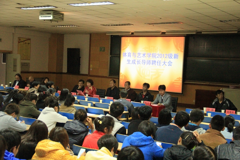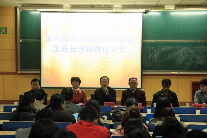 2012年10月18日下午,体育与艺术学院在09102教室举行2012级新生成长导师聘任仪式,学生处处长邱建国教授、院长刘定一教授,院总支书记王琳教授,教学副院长曹电康教授,党总支副书记曹凤才老师;体育系主任付奕老师,副主任续俊老师;音乐系主任王燕平老师,副主任韩晋宁老师;艺术系主任王旭东老师,新生成长导师,全体辅导员老师等出席了本次大会。会议由党总支副书记曹凤才主持。