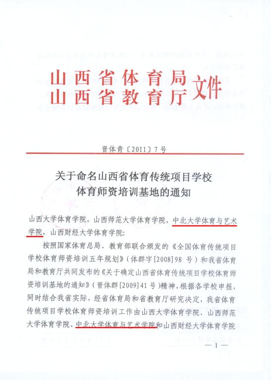 近日,山西省体育局、教育厅联合下发《关于命名山西省体育传统项目学校师资培训基地的通知》,命名我院为山西省体育传统项目学校师资培训基地。