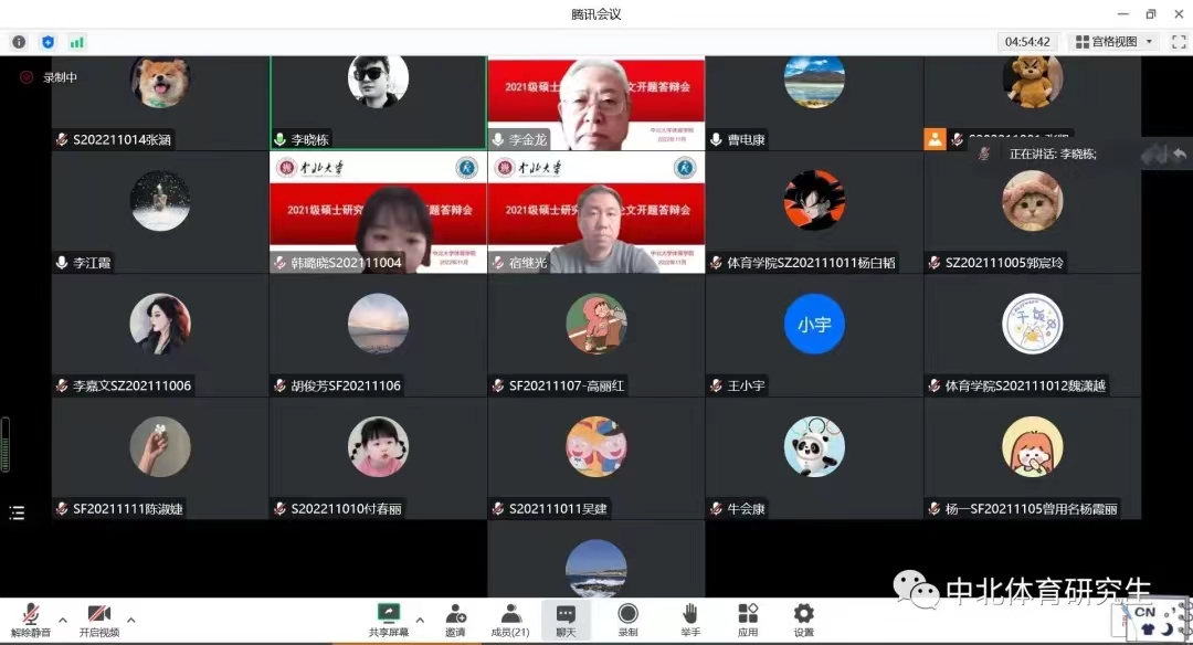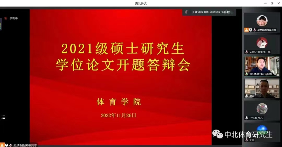 11月26日,做爱视频 2021级硕士研究生学位论文线上开题答辩会于线上腾讯会议举行。开题答辩会特邀山西大学博士生导师李金龙教授、山西省体育局体育科学研究所董建国研究员、山东做爱视频 硕士生导师宋祺鹏教授、忻州师范学院硕士生导师张翔教授担任各小组评委主席,各方向学科带头人、导师分别出席本次答辩会。全体2021级研究生参加线上答辩,2022级研究生进行在线旁听。